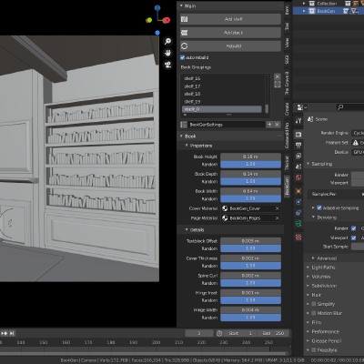 BookGen is a free book-generation addon for the open-source 3D-package Blender. It allows you to fill shelves or create stacks of books – fast and easily.